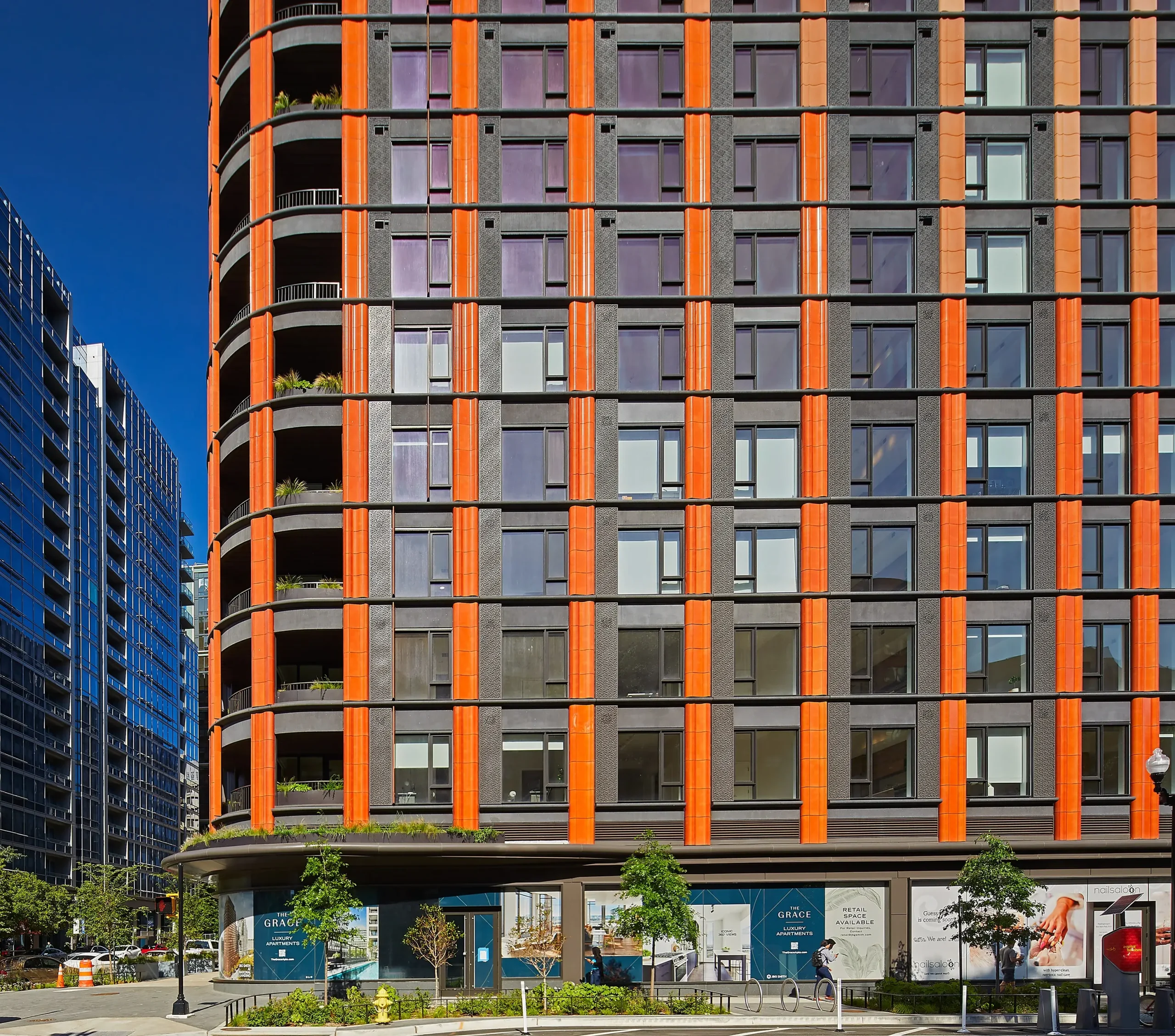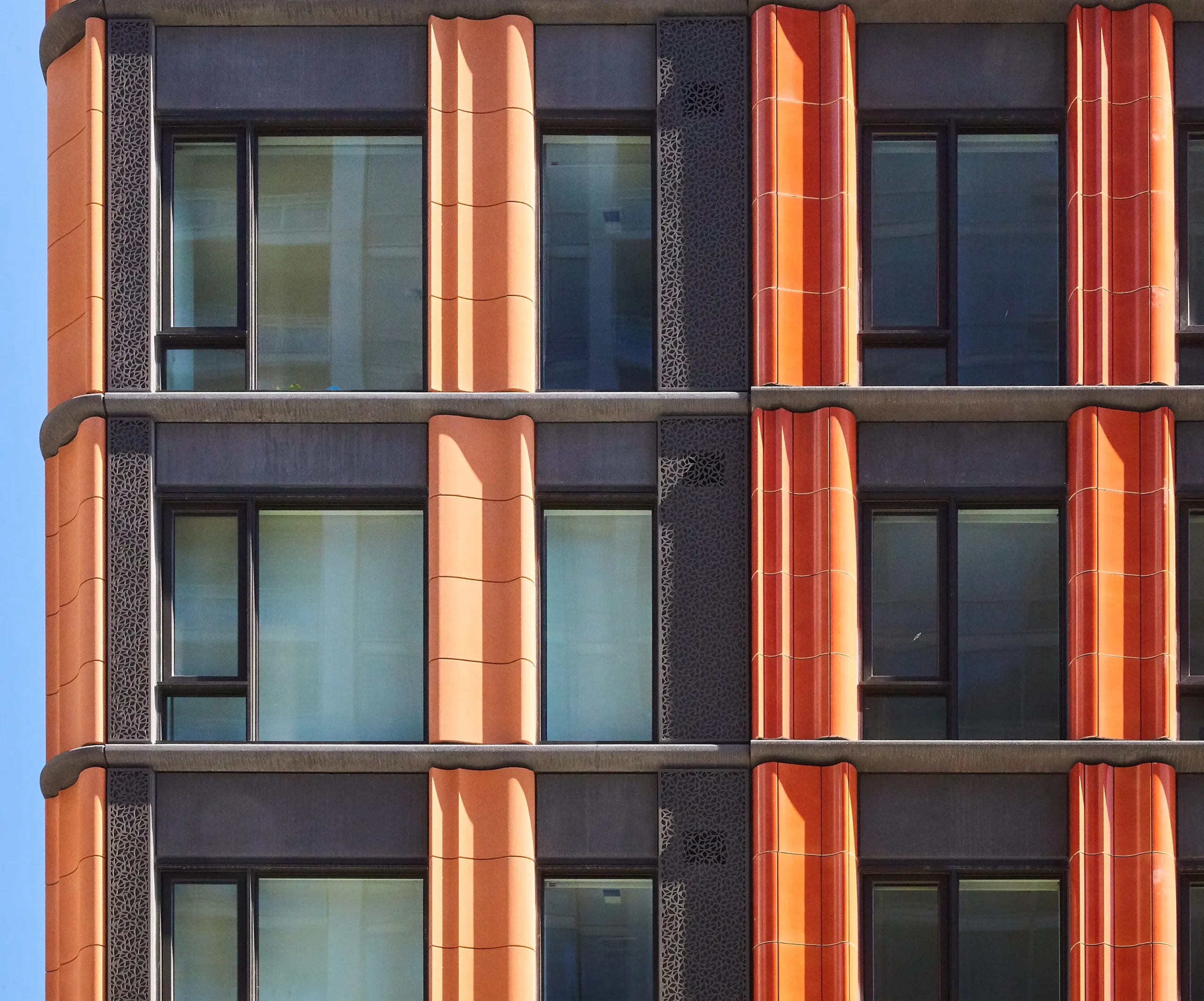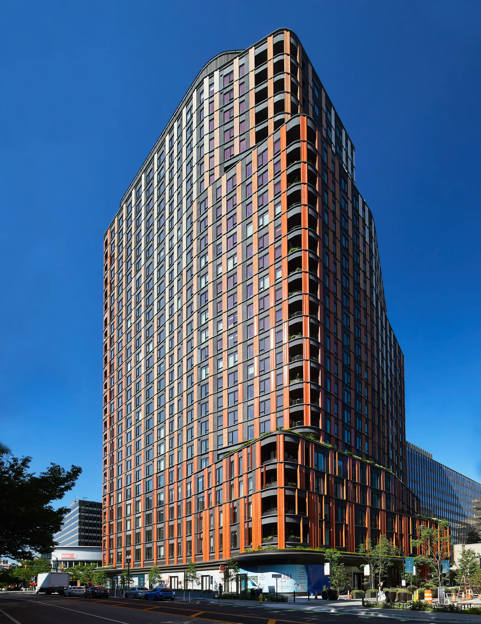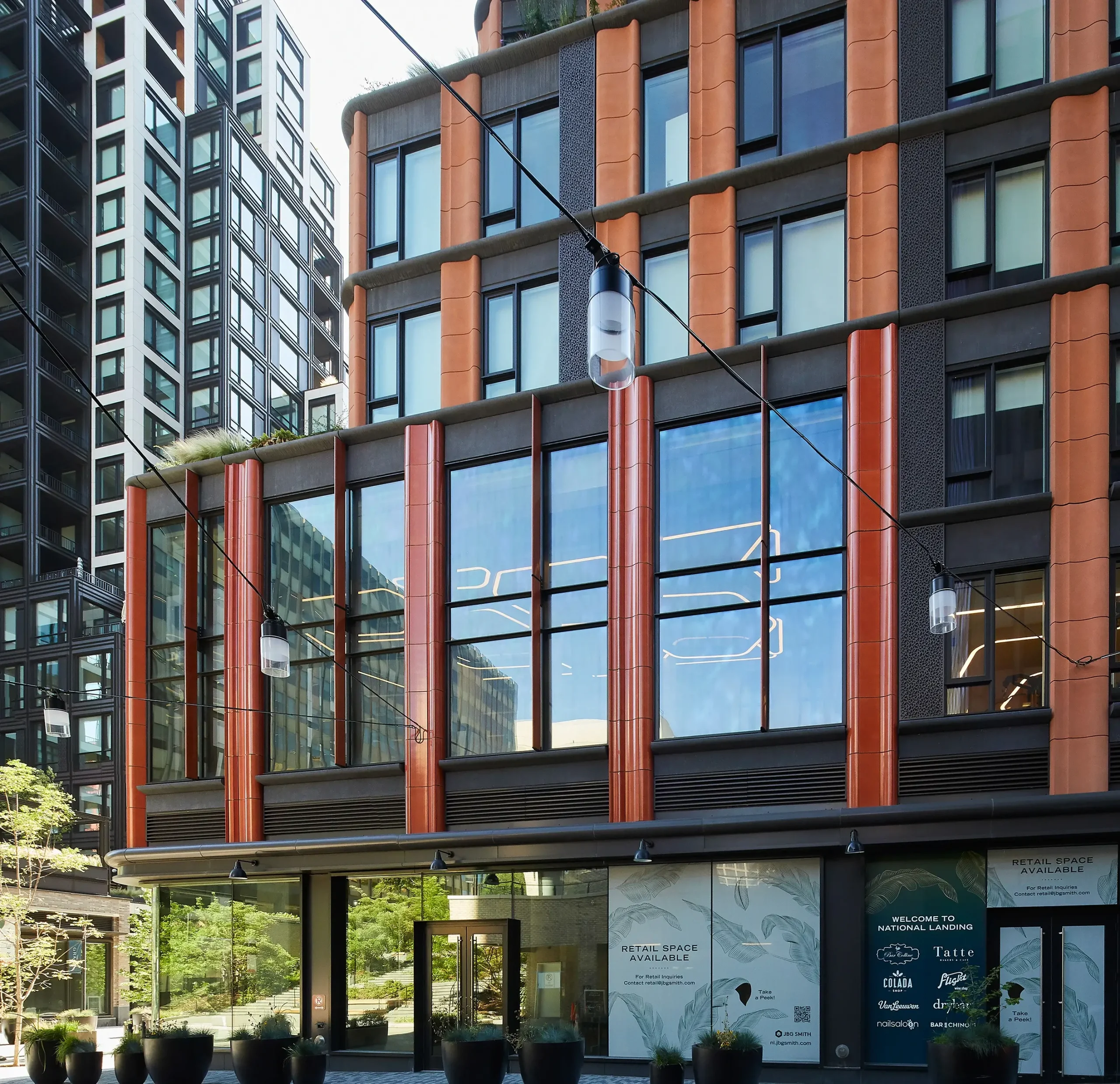 The striking South Tower, one of two newly built residential complexes in National Landing, “illuminates” the booming business district with its vibrant design and impressive colour scheme on the façade. Glazed ceramic elements in a warm terracotta tone emphasise the height of the tower as regular vertical pillars and characterise its structure. The organic material is a reminder of the geological and industrial history of the district, which was once home to numerous brickworks. The meandering Pontomac River provided the inspiration for the curved shape of the building, which makes it a unique eye-catcher.